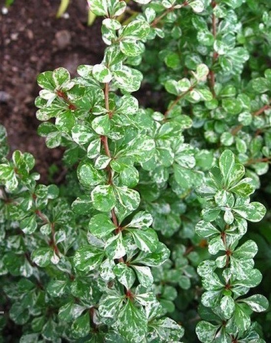 Листья зелёные, украшены яркими белыми пятнами и мазками, которые осенью приобретают оттенки от ярко-розового до насыщенно тёмно-красного цвета.